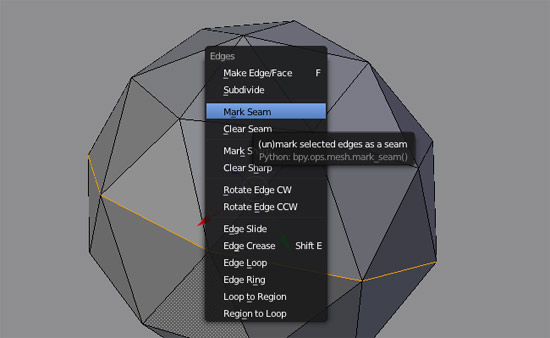 Highlight edges going around the sphere (orange). Press Control + E. Select the option “Create seams”. This is where the UV unwrap will know where to cut the polygon when it puts it on a texture.