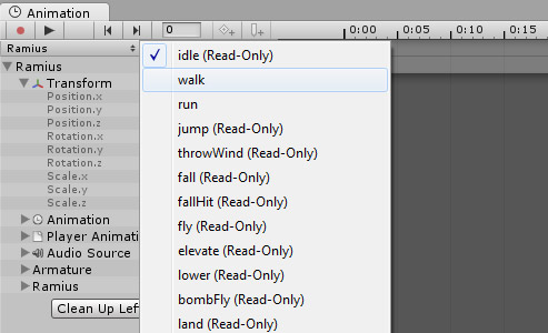 The above image is the type of thing you want to copy. If you aren’t using the model in my project, Ramius is the character’s model I made in Blender3D. Unity will create all of these items based on your import settings. The animations were created in the import settings as well with the names you give them. Select the animation like above copy and paste it.